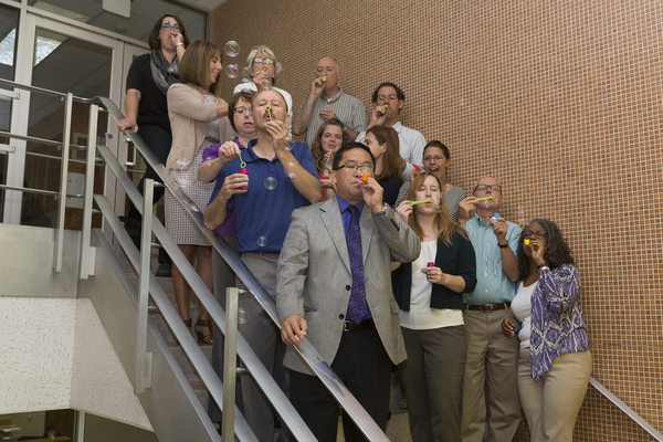 United Way campaign leaders have some fun with bubbles as they kick off the 2014 campaign for faculty and staff. The year's theme was "Bursting the Andrews Bubble." (Photo by Darren Heslop, IMC staff photographer)