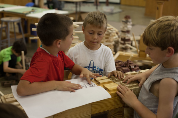 Participants in the 2014 Renaissance Kids event follow plans to build something with large wooden blocks. (Photo by Christa McConnell, IMC student photographer)