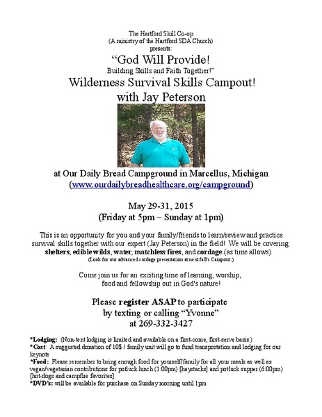 The Hartford Skill Co-op (a ministry of the Hartford SDA Church) presents: "God Will Provide! Building Skills and Faith Together" - a wilderness survival skills campout with Jay Peterson at Our Daily Bread Campground in Marcellus, Michigan.