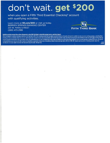 Currently Fifth Third Bank is have an amazing $200.00 new checking account promotion. Attached you will find the flier with the details around it. Our local banking team would love to assist with anyone interested.