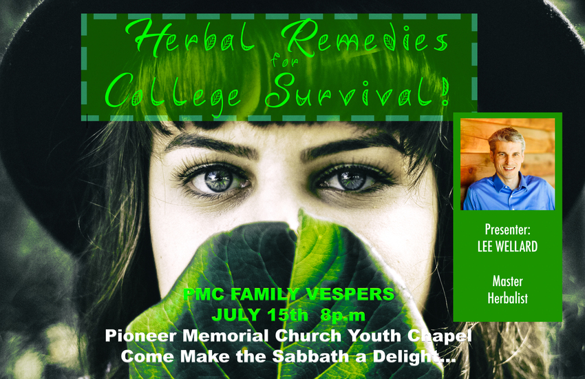 PMC Family Vespers will be held Saturday, July 15, at 8 p.m. in the PMC Youth Chapel You are welcome to close the Sabbath with us and hear a health program presented by Lee Wellard, herbalist.