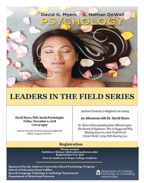 Andrews University is delighted to be hosting David Myers on Friday, Nov. 2, 2018, from 1–4 p.m. in Newbold Auditorium, Buller Hall. His presentations include the following: