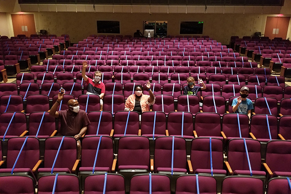 In preparation for Faculty Institute, Darcy de Leon, director of Human Resources, Christon Arthur, provost, and their families taped off seating in the Howard Performing Arts Center to accommodate physical distancing.