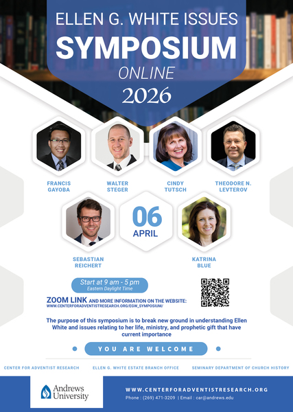 Mark your calendar and join us for the virtual Ellen G. White Issues Symposium sponsored by the Center for Adventist Research, the Ellen G. White Estate Branch Office and the Department of Church History. It will be held on Monday, April 6, 2026, from 9 a.m.–5 p.m.