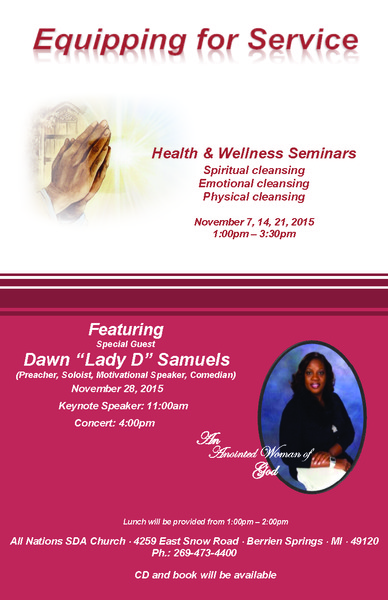 You are invited to a life changing holistic wellness series entitled "Equipping for Service"   The first seminar will be held November 7, 2015 from 1:00-3:30PM at the All Nations Seventh-day Adventist Church. ... read more