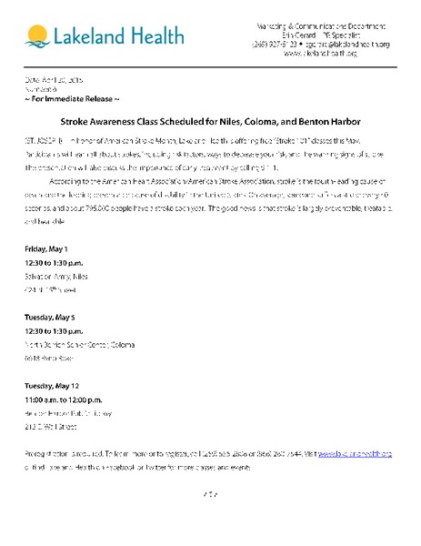 Stroke Awareness Class Scheduled for Niles, Coloma, and Benton Harbor (ST. JOSEPH) – In honor of American Stroke Month, Lakeland Health is offering free “Stroke 101” classes this May. Participants... read moreEau Claire for April 18