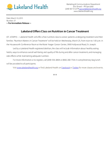 Lakeland Offers Class on Nutrition in Cancer Treatment (ST. JOSEPH) – Lakeland Health will offer a free nutrition class to cancer patients undergoing treatment and their families. “Nutrition Matters in Cancer Treatment” will... read moreNiles-Westside Church Service for March 14