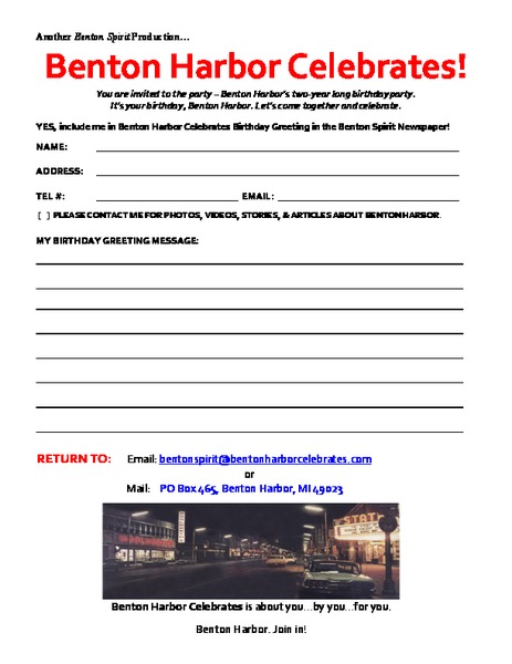 Say Happy Birthday to Benton Harbor. On March 14, 2015 Benton Harbor celebrates 150 years. You can send your greeting to us in any of the three ways: 1. Upload... read moreEmpty Bowls 20th Anniversary Soup Supper