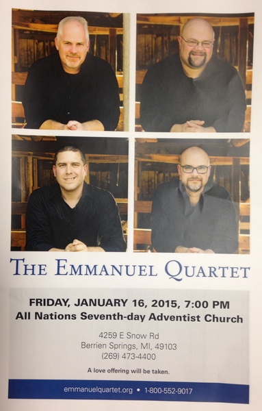 The Emmanuel Quartet will be performing for vespers at the All Nations Seventh-day Adventist Curch on Friday, January 16, at 7 pm. Please see poster for more details.