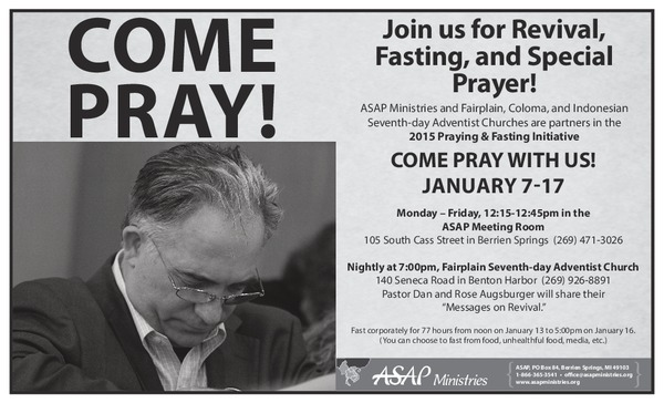 Join us for Revival, Fasting, and Special Prayer ASAP Ministries and the Fairplain, Coloma and Indonesian Seventh-day Adventist Churches are partners in the 2015 Praying & Fasting Initiative, January 7–17. ... read moreNedley Depression Recovery Seminar