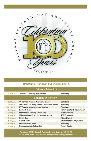 On October 31 & November 1, the Village SDA Church is celebrating the 100 years anniversary. Come join us in the celebrating a century of grace and provisions God has given to the Village Church.