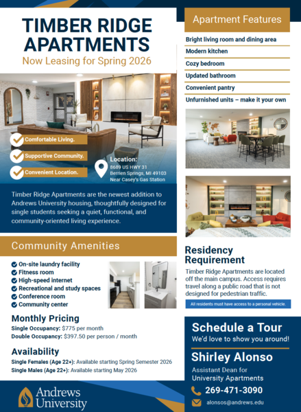 Timber Ridge Apartments are the newest addition to Andrews University housing, thoughtfully designed for single students seeking a quiet, functional and community-oriented living experience. Apartment Features ...