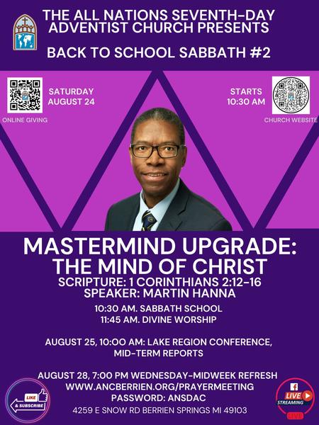 Join the All Nations SDA Church for a wonderful worship experience, this Saturday, August 24 @ 11:45 am, as Martin Hanna presents "Mastermind Upgrade: The Mind of Christ." Sabbath School begins @ 10:30 am. Breakfast is served @ 10 am.... read more