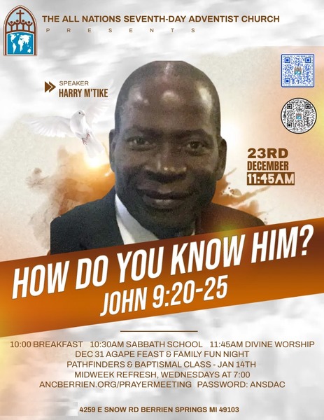 Join the All Nations Seventh-day Adventist Church for an uplifting worship experience this Saturday, December 23 at 11:45 a.m., where Harry Mtike will present "How Do You Know Him?" Adult and children's Sabbath School begin at 10:30 a.m....